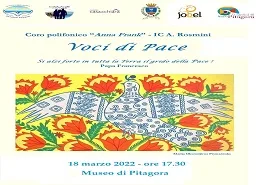 Saranno "voci di pace" quelle che si leveranno domani, 18 marzo, al Museo di Pitagora in occasione del concerto che il Coro Polifonico della Scuola Anna Frank dedicherà al valore assoluto dell'uomo, la pace, ed in particolare agli ospiti ucraini dell'Ostello "Casa di Chiara"