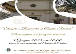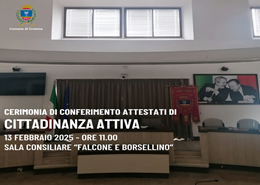 Il 13 febbraio 2025 alle ore 11.00 nella Sala Consiliare "Falcone e Borsellino" del Comune di Crotone si terrà la cerimonia di conferimento degli attestati di merito alle associazioni cittadine