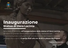 Il 19 marzo 2025 alle ore 15.00 nella Sala Consiliare "Falcone e Borsellino" del Comune di Crotone si terrà la conferenza stampa di presentazione dell'installazione della statua di Hera Lacinia voluta dall'amministrazione Comunale